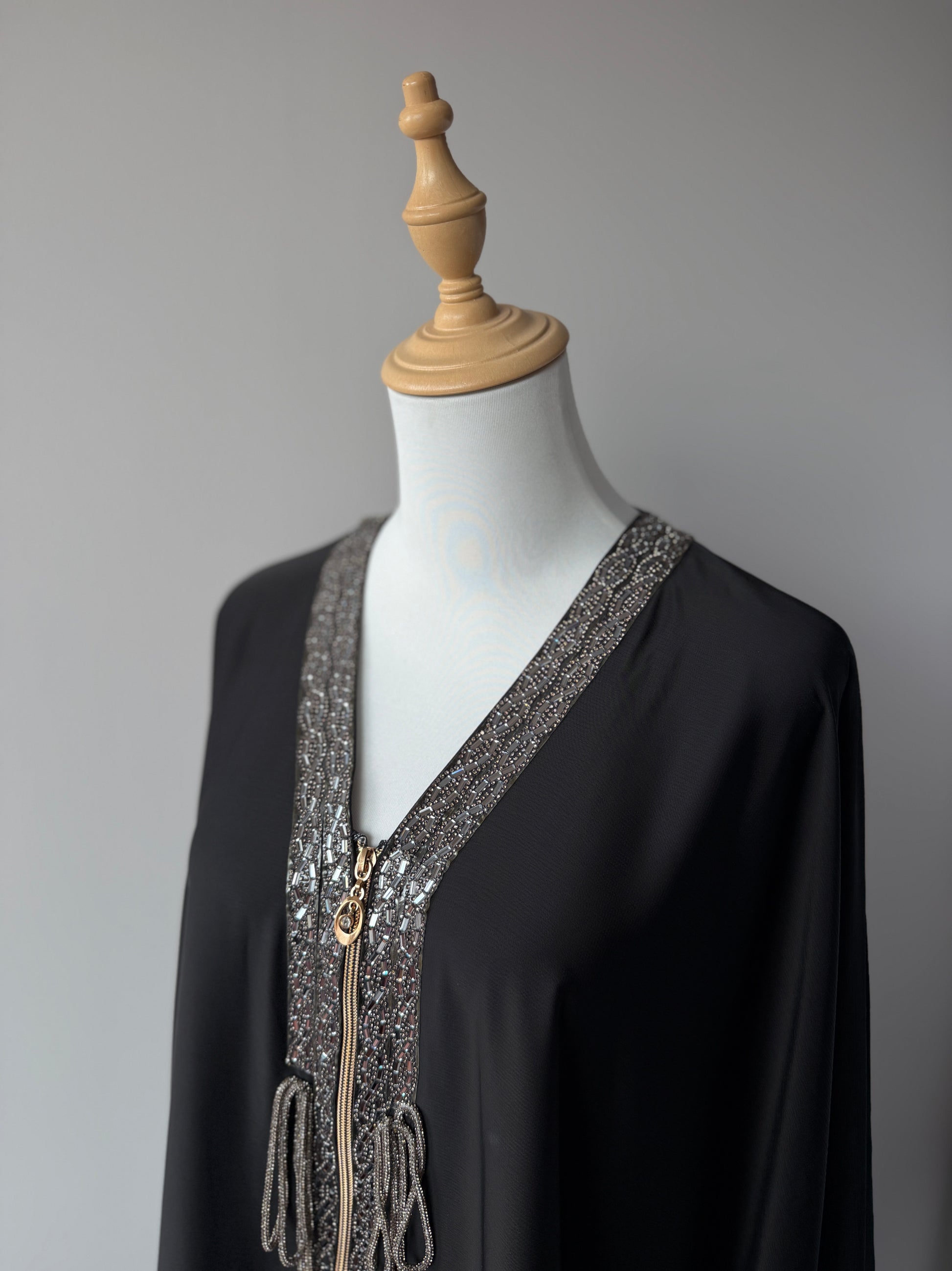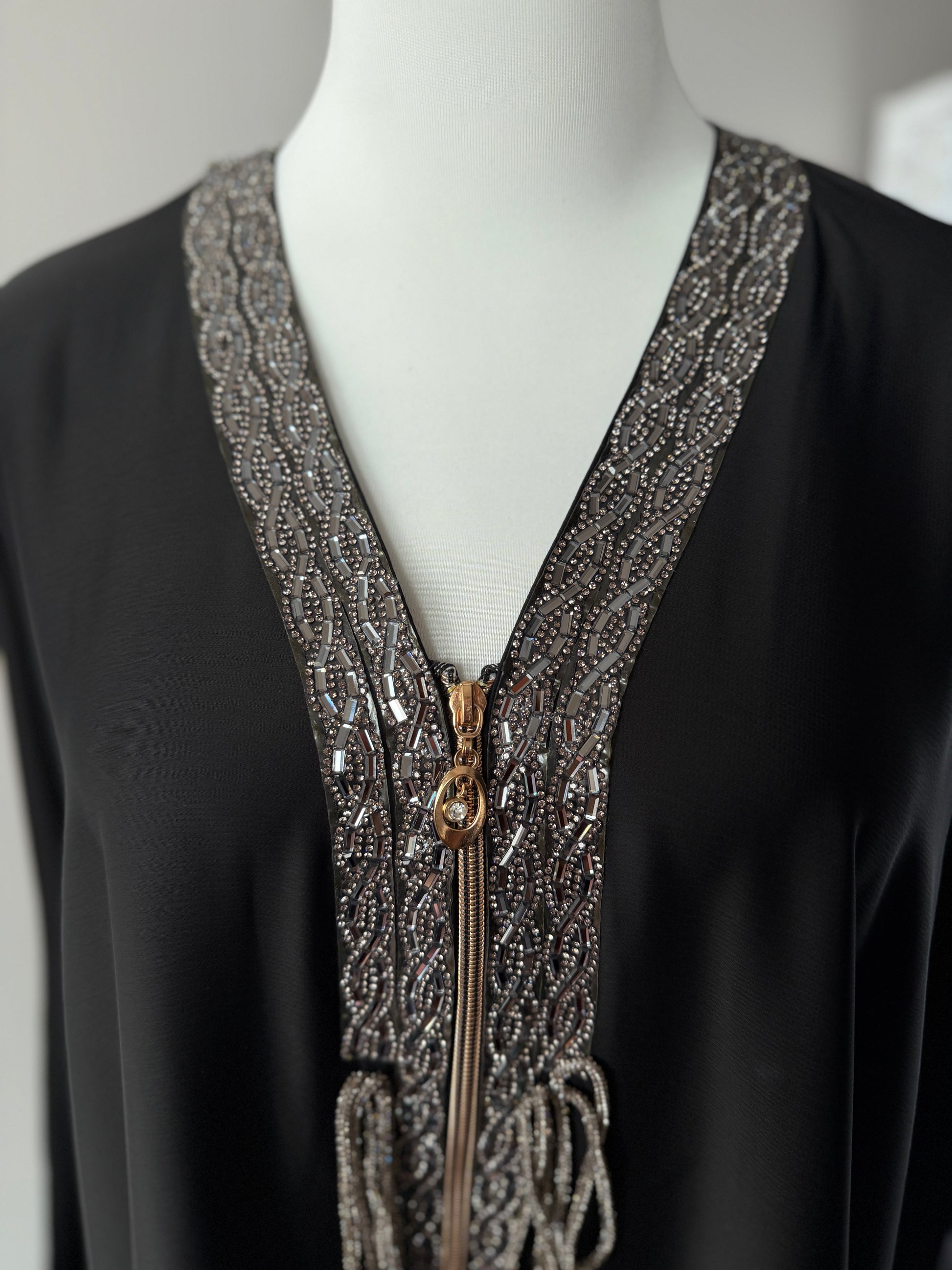 The Dubai Abaya – Sana is an elegant kaftan-style abaya featuring a front zip closure for easy wear and a refined silhouette. The neckline and sleeves are beautifully enhanced with diamond embellishment detailing, giving it a luxurious finish perfect for occasions, gatherings, or elevated modest styling.