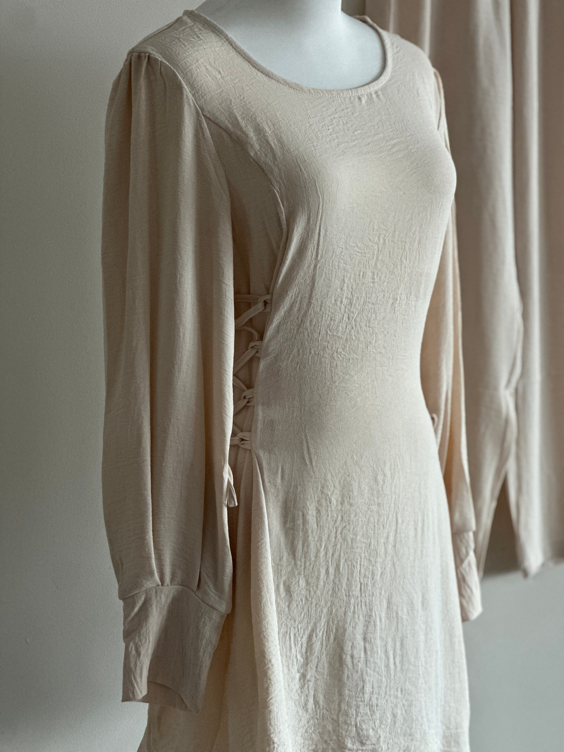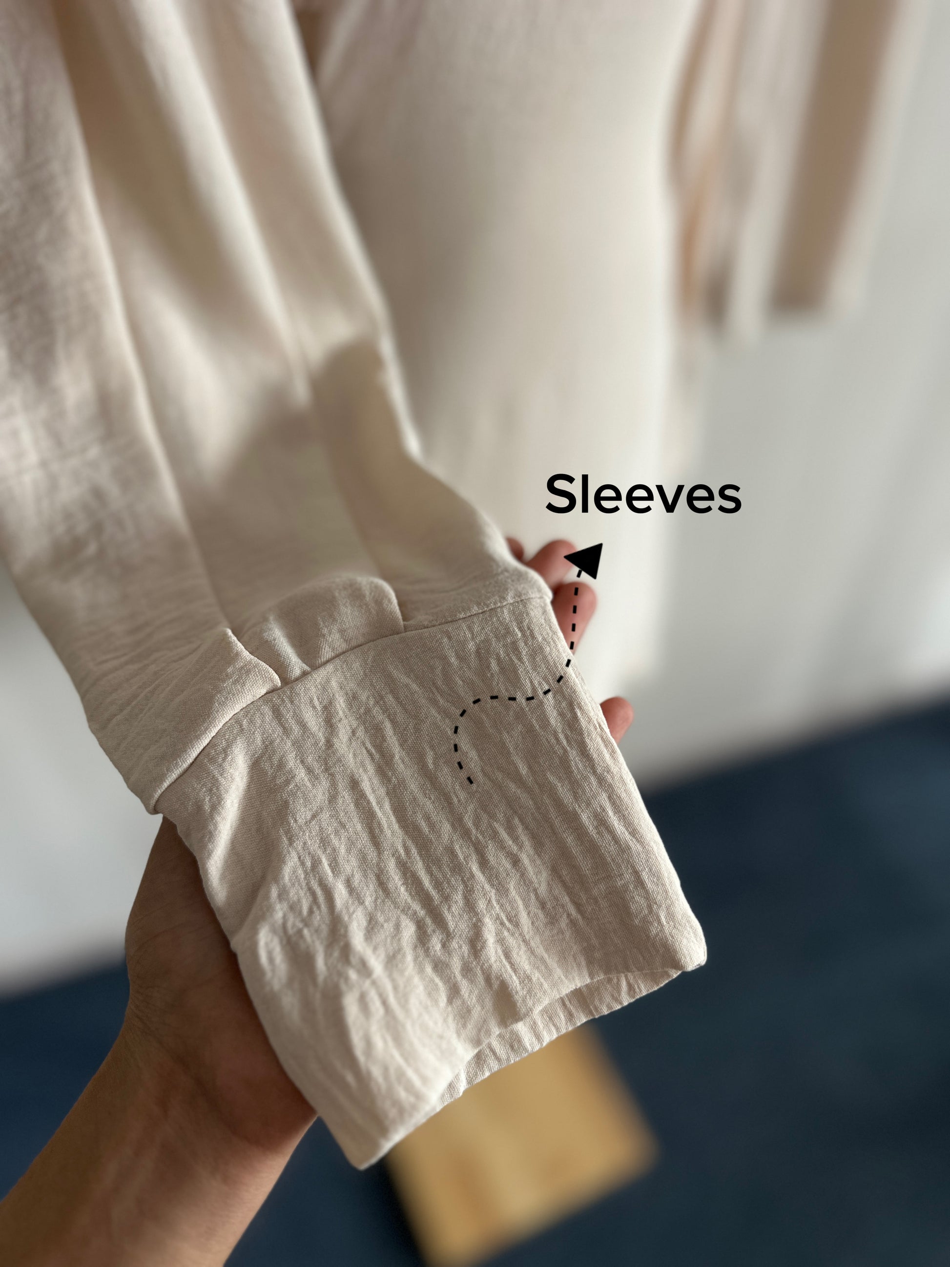 The Reem Co-ord Set in Beige is designed for ease, elegance, and everyday modest fashion. This set includes a beautifully tailored top with ribbon-tie detailing on both sides and subtle pleated balloon sleeves, finished with a single pearl button at the back. It comes with matching straight-fit pants for a complete modest look suitable for all seasons.