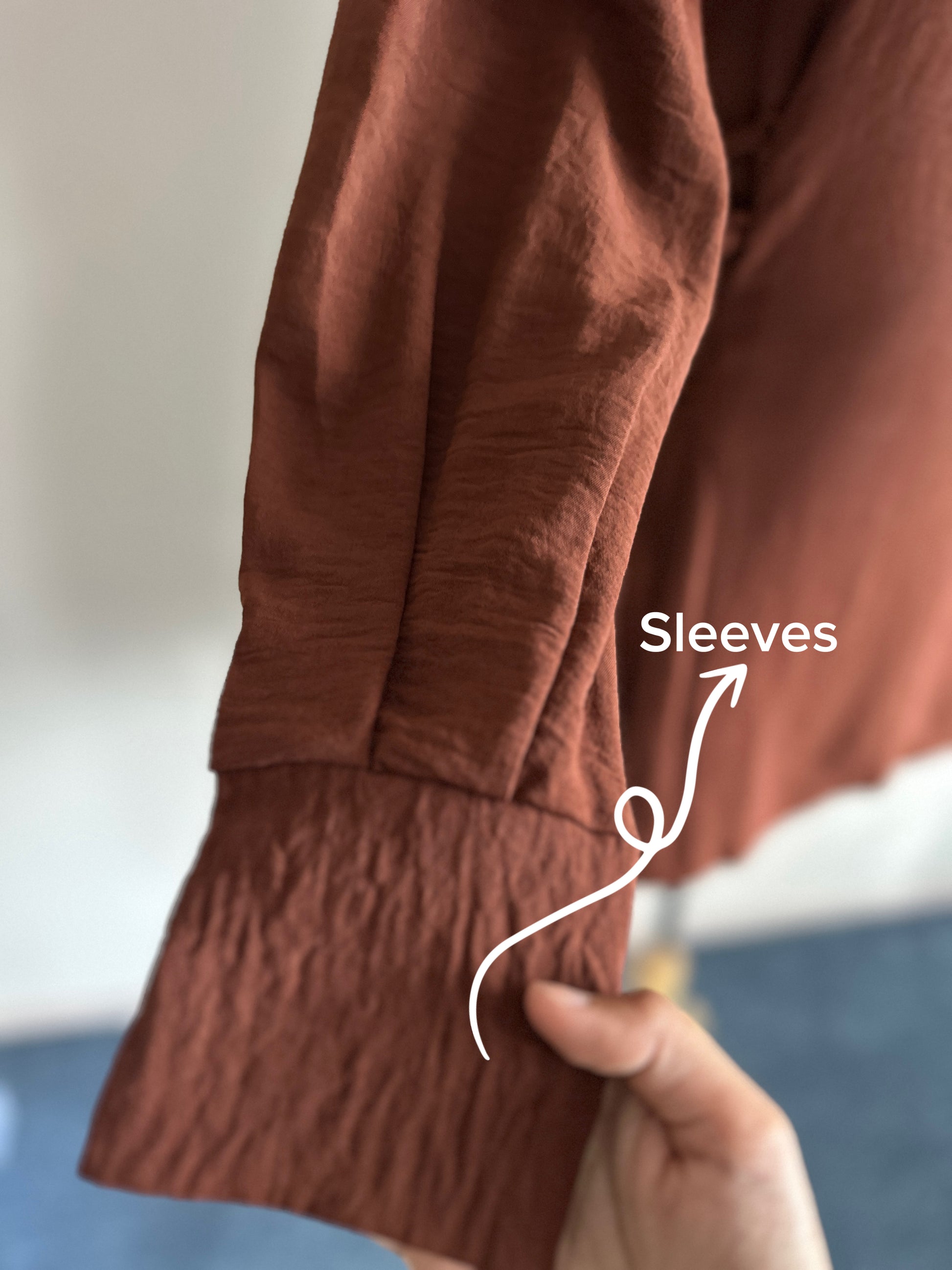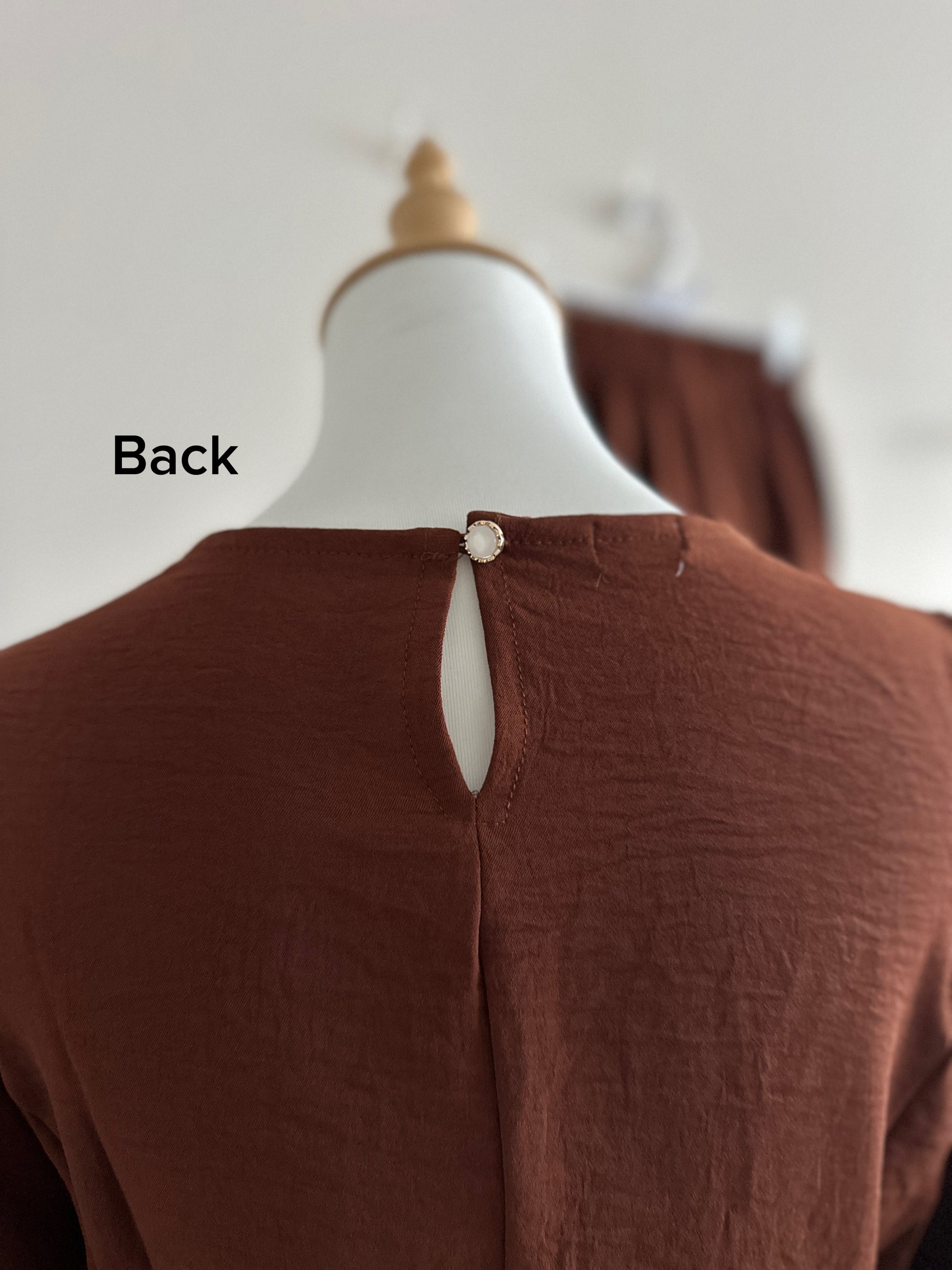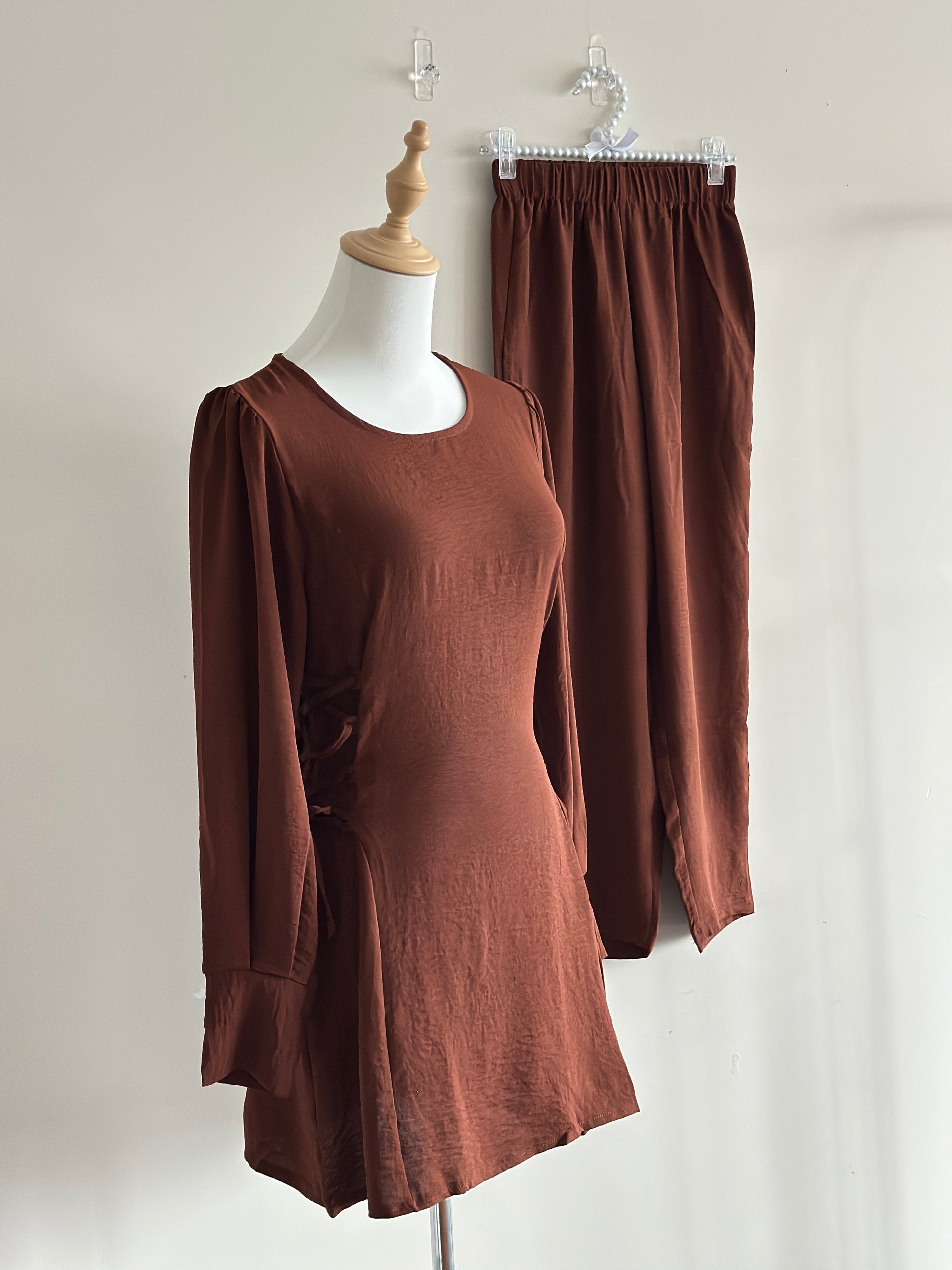 The Reem Co-ord Set in Brown is designed for ease, elegance, and everyday modest fashion. This set includes a beautifully tailored top featuring ribbon-tie detailing on both sides, along with pleated sleeve accents that create a subtle balloon-sleeve effect. A single pearl button at the back completes the look, making it stylish and easy to wear. The matching pants offer a clean, polished silhouette perfect for work, outings, or daily modest wear in New Zealand.